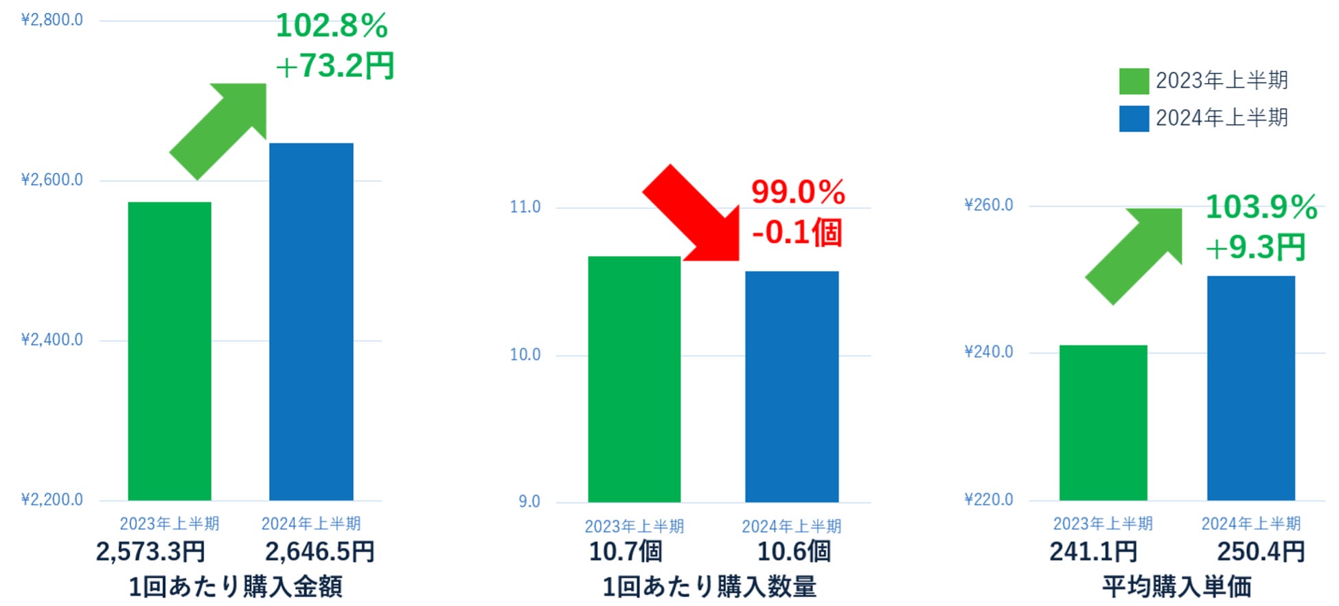 1回あたりの購入金額は+73.2円(前年比102.8%)増加しています。1回あたり購入数量(買い物かごに入れる数)で見ると0.1個(前年比99.0%)減少していますが、1商品あたりの平均購入単価が+9.3円(前年比103.9%)上昇していることにより、1回あたりの購入金額(買い物金額)が増加していることになります。