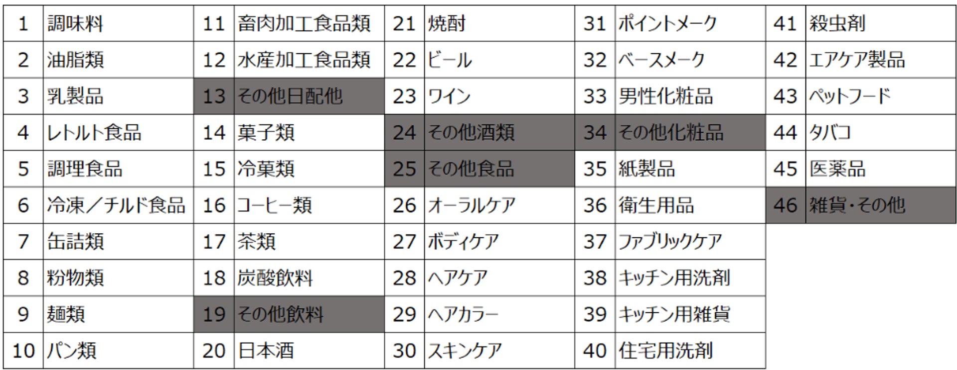 全46カテゴリ中、40カテゴリから選択いただけます。「その他カテゴリ」に関してはお選びいただけませんので留意ください。より詳細なカテゴリ区分、ブランド別、商品別の分析などご希望やご相談がありましたら、お気軽に問い合わせフォームにあります「ご質問・ご要望」欄にご記載ください。