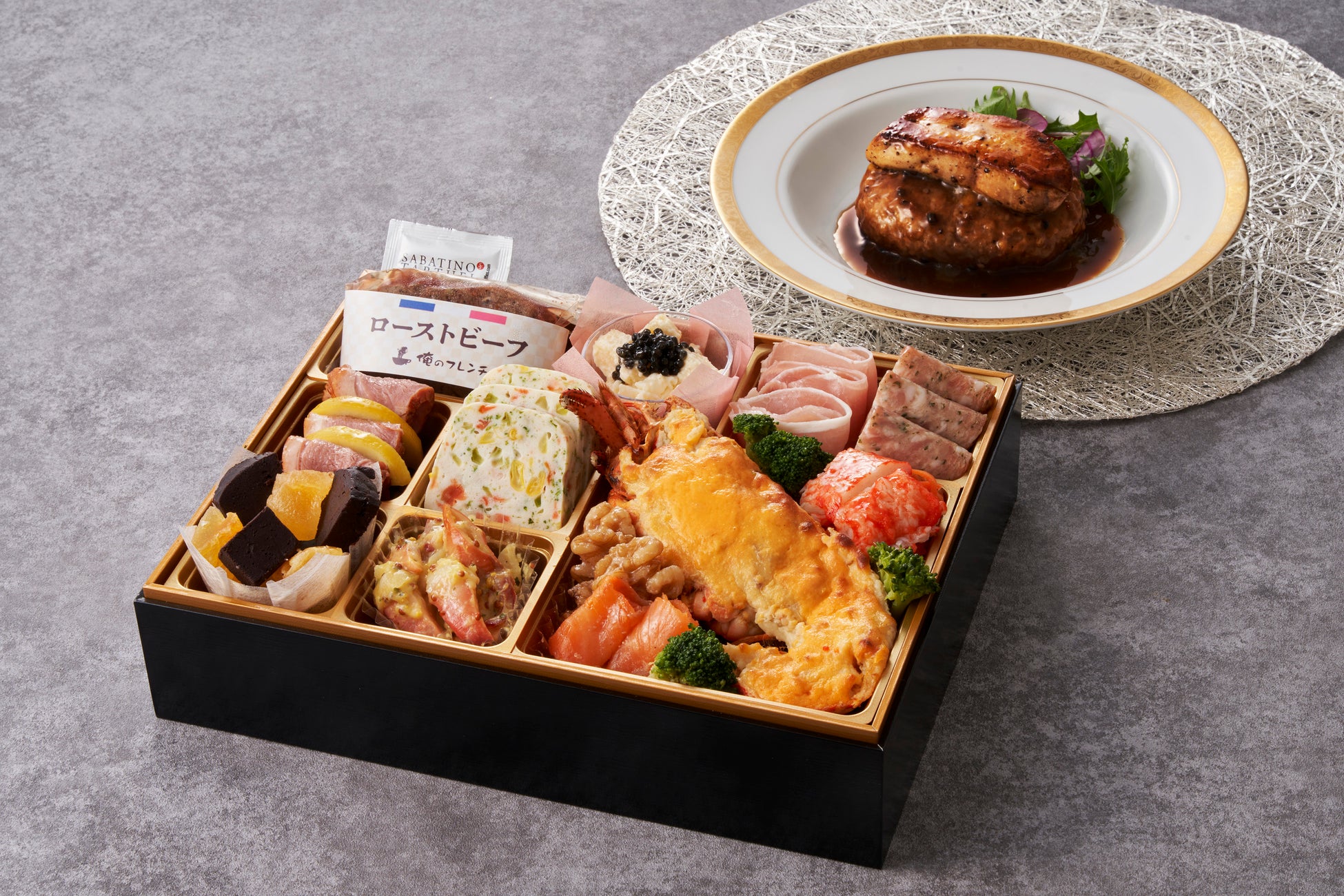 オマール海老の身にウニソースを絡めた「オマール海老のウニソース焼き」やローストビーフなど高級食材の数々。さらに、ロッシーニ風ハンバーグが1食。豪華組み合わせは、当店のみの販売です。
