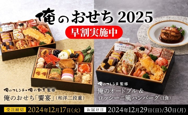 俺の株式会社(所在地:東京都中央区、代表取締役社長:立石 寿雄)は、俺のシリーズ公式オンラインショップ「俺のEC」では、毎年ご好評をいただいている「俺のおせち」を2種類販売いたします。お得にご利用いただける「早割」もご用意しております。