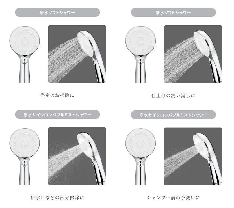 サイクロンバブルミストシャワー/ソフトシャワー、それぞれの原水/浄水と、計4つの水形をスライド操作で簡単に切り替え可能。シャンプー前の予洗いや仕上げの洗い流し、浴室のお掃除など、使用シーンに合わせて、最適な水形をお使い分けいただけます。