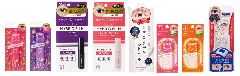 写真 左からアイトーク、アイトーク スーパーホールド、アイトーク ハイブリッドフィルム ハード、アイトーク ハイブリッドフィルム スーパーマット、アイトーク 大人のまぶたコントロール、アイトーク テクニカルアイテープ スリム/ワイド、アイトーク ワンタッチアイテープ