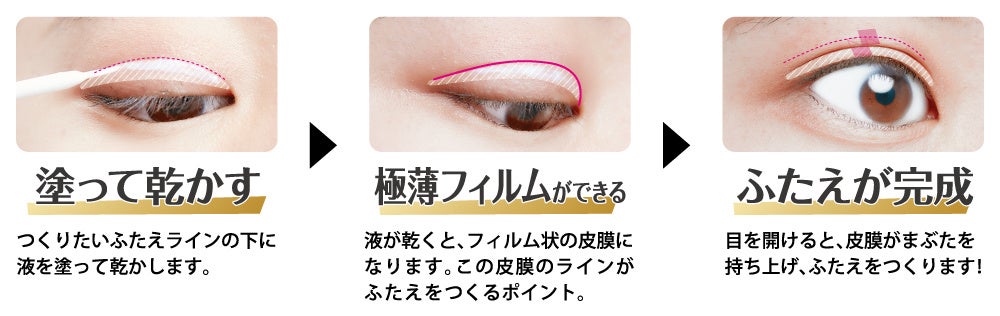 リキッドでつくったフィルムが支えになって、まぶたを物理的に押し上げることで、まぶたが折り込まれて「リアルなふたえ」のように見えます。