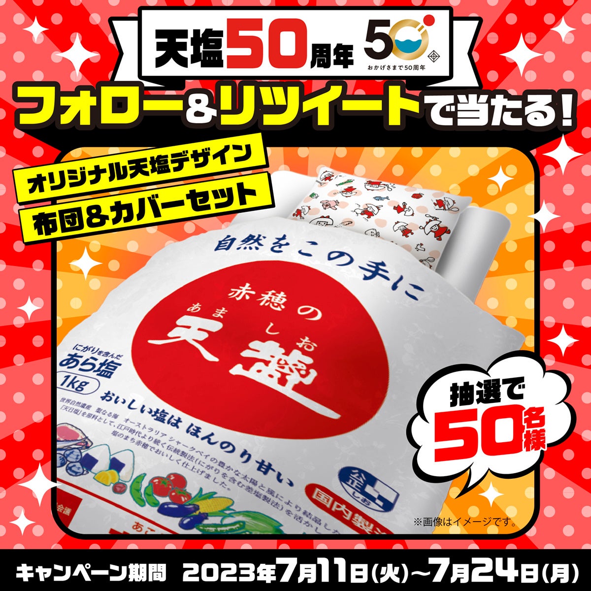 赤穂の天塩を販売する株式会社天塩(本社:東京都新宿区、代表取締役社長:鈴木 恵)は、誕生50周年を記念しまして、「#あましおふとんをもらおうキャンペーン」を設立日である7月11日(火)から7月24日(月)まで開催いたします。天塩公式Twitterをフォロー&リツイートしてくださった方の中から、抽選で50名様にオリジナル天塩デザイン寝具セットをプレゼントします。