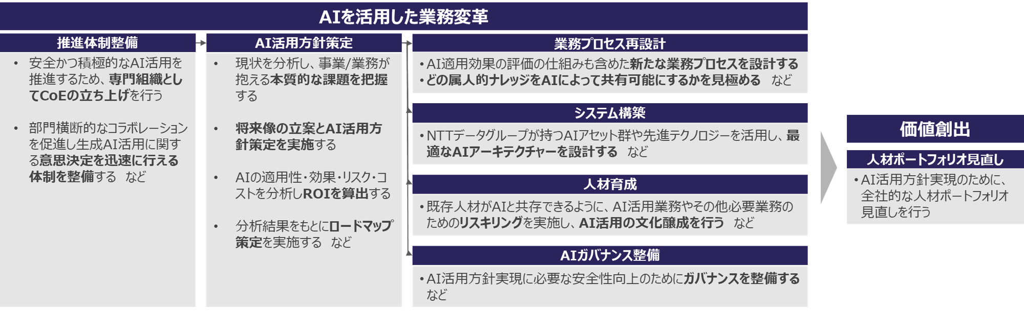 AI活用方針の実現に向け、全社的な人材ポートフォリオの見直しと再配置を行い、AI導入効果の最大化を図ります。
