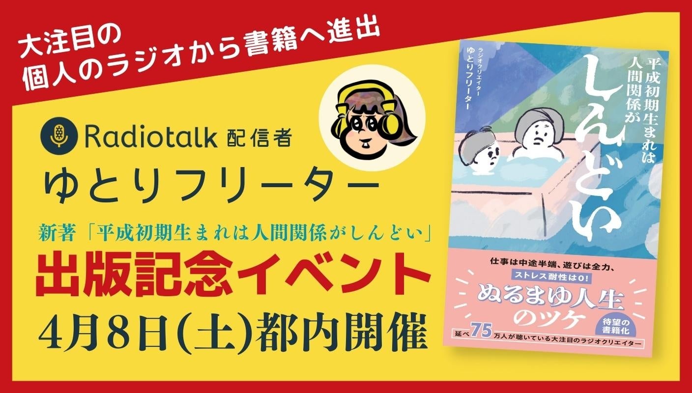 Radiotalk株式会社は、大注目の個人ラジオ番組「ゆとりは笑ってバズりたい」の配信者である「ゆとりフリーター」による初の書籍『平成初期生まれは人間関係がしんどい』の発売を記念して、リスナーへの感謝を込めたトークイベントを都内で開催いたします。