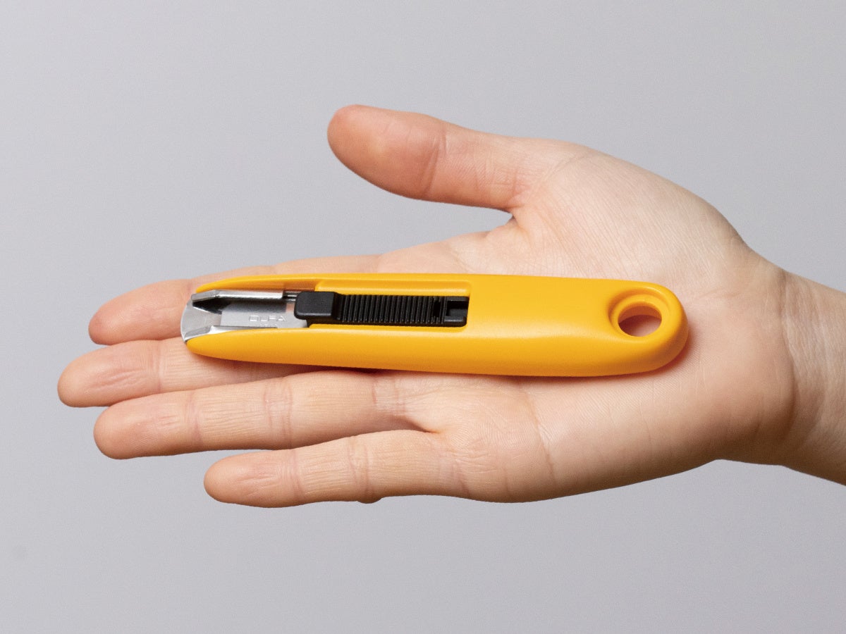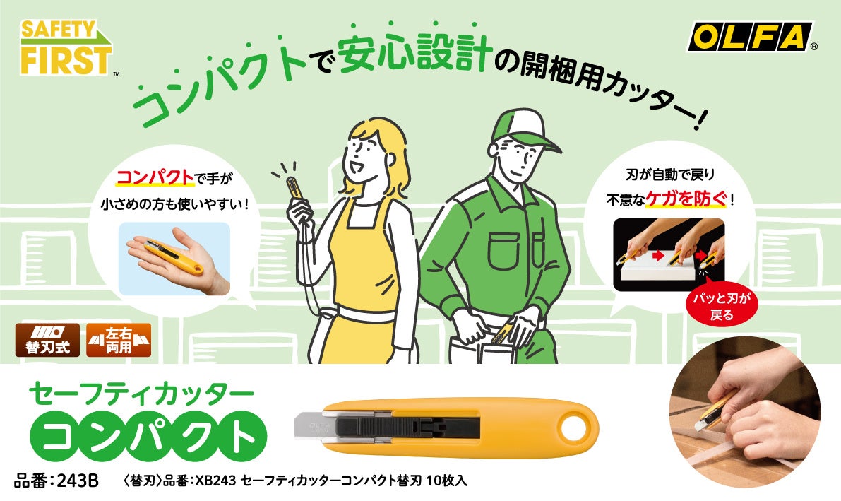 セーフティカッターコンパクトは、手が小さめの方にも使いやすいコンパクトさが特長の開梱用カッターです。切り終わると刃が自動で収納され、開梱作業で起こりやすいケガを防止します。開梱・開封作業を頻繁に行う方や、これまでの開梱用カッターが大きすぎると感じていた方におすすめです。