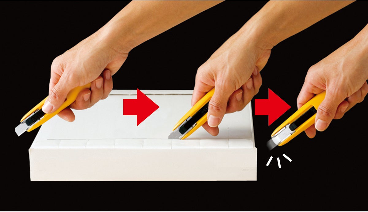 刃が切断対象物から離れると、スプリングにより刃が自動で収納されます。切った勢いで体に刃が当たったり、出しっぱなしの刃に不意に触ったりすることで起こるケガを防ぎます。