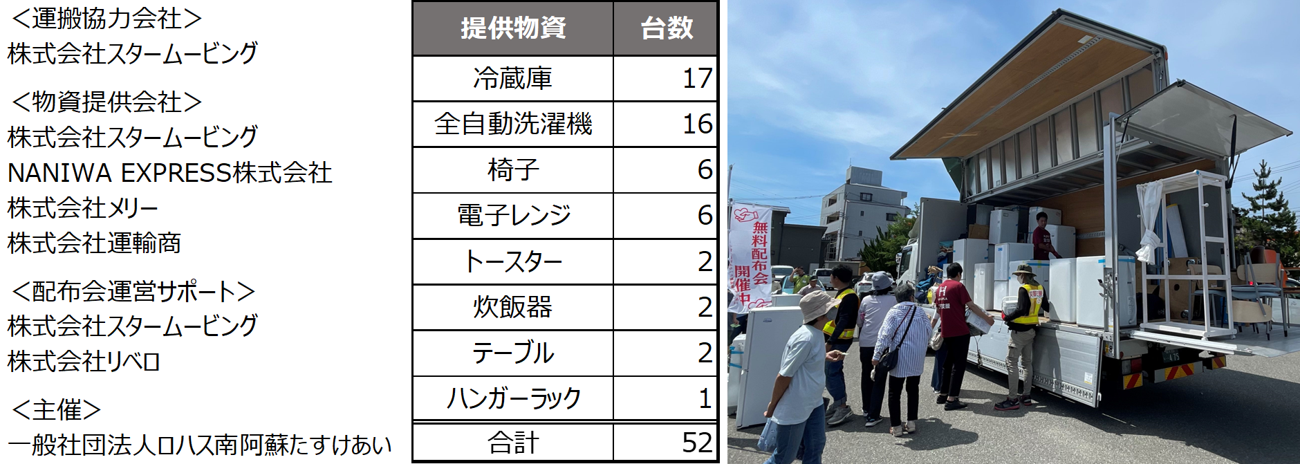 配布会には80名を超える現地の方々が参加、『ロハス南阿蘇たすけあい』による提供物資と合計で76点の物資の譲渡が完了しました。配布会での提供物資と参加した当ネットワークの参加引越会社は以下の通りです。