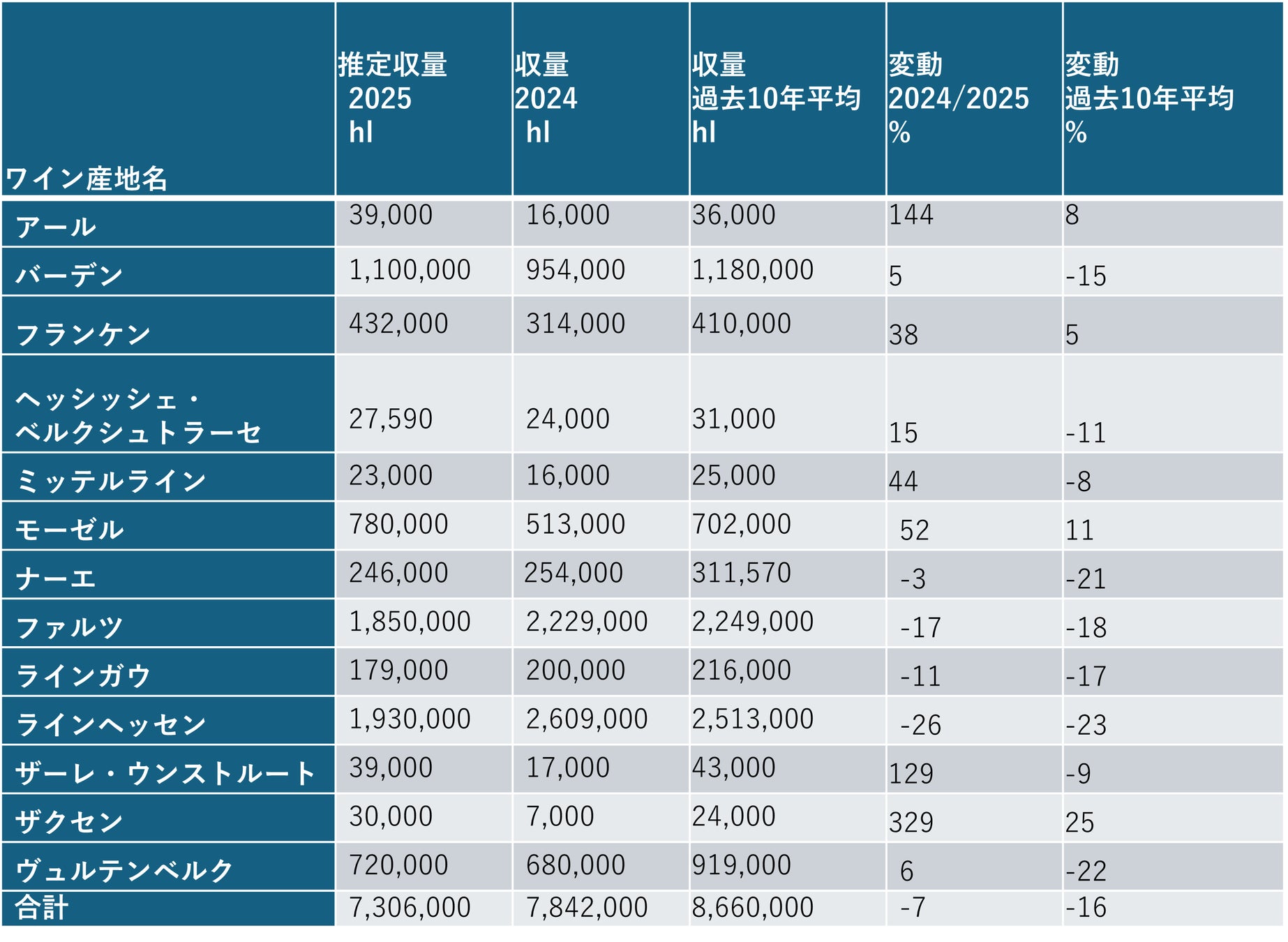 一方、春の遅霜により深刻な被害を受けた地域の多くでは、今年は良好な収穫が期待されています。特にザクセンとザーレ・ウンストルートの2つの東部地域、そして前年から3桁増となる数量を記録したアールが顕著です。また、モーゼルとフランケンでは、今年の収穫量が例年をわずかに上回る見通しです。