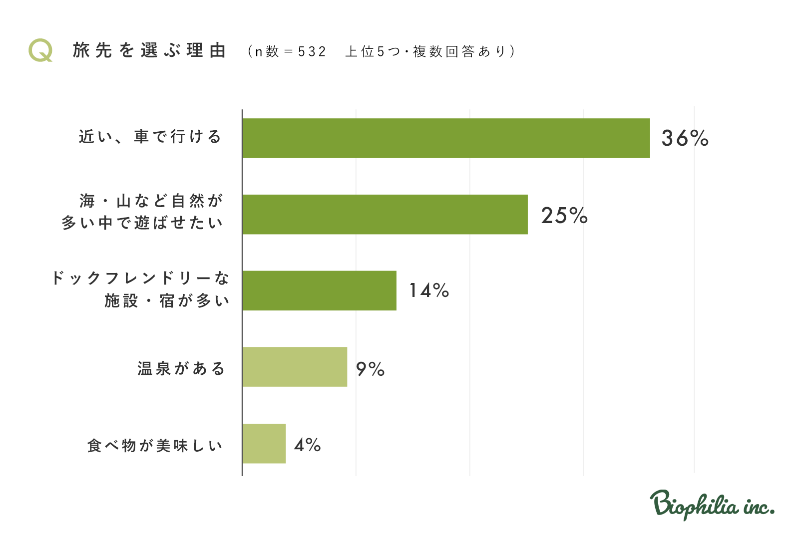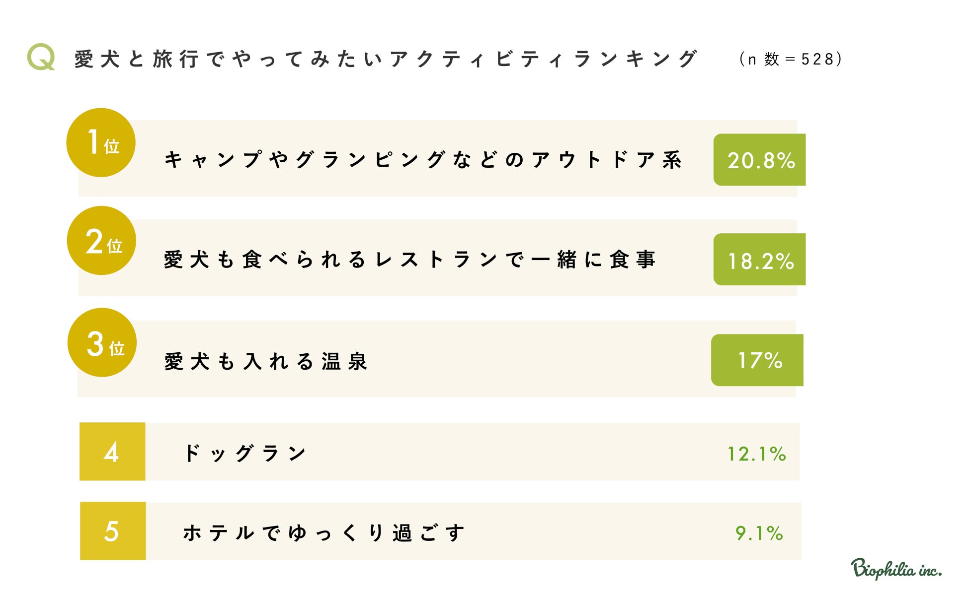 実際に旅先で経験したアクティビティ上位3つ(n数=400 複数回答)が、ドッグラン(78%)、レストランで一緒に食事(64%)、ホテルでゆっくり過ごす(45%)であることと比較し、犬連れOKのキャンプ・グランピング施設や、犬も入れる温泉など、近年のペットフレンドリー施設の充実により飼い主の意向もより広がりを見せています。