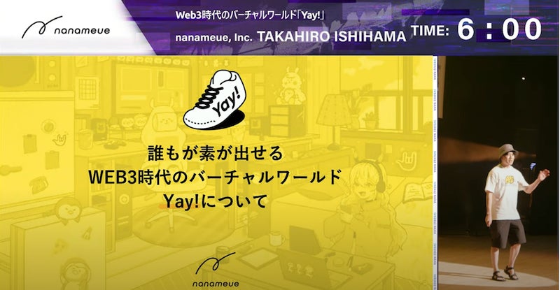 2007年から開催されているIVS LAUNCHPADは、新たな時代を牽引する企業の経営者・経営幹部・投資家が一堂に会する、国内最大級のスタートアップピッチコンテストです。本イベントの決勝戦にて、『誰もが素が出せるWeb3時代のバーチャルワールド「Yay!」』と題して代表取締役 石濵 嵩博が登壇し、圧倒的な次世代のサービスのパワーとその将来性において、著名な審査員のポジティブな評価に繋がりました。
