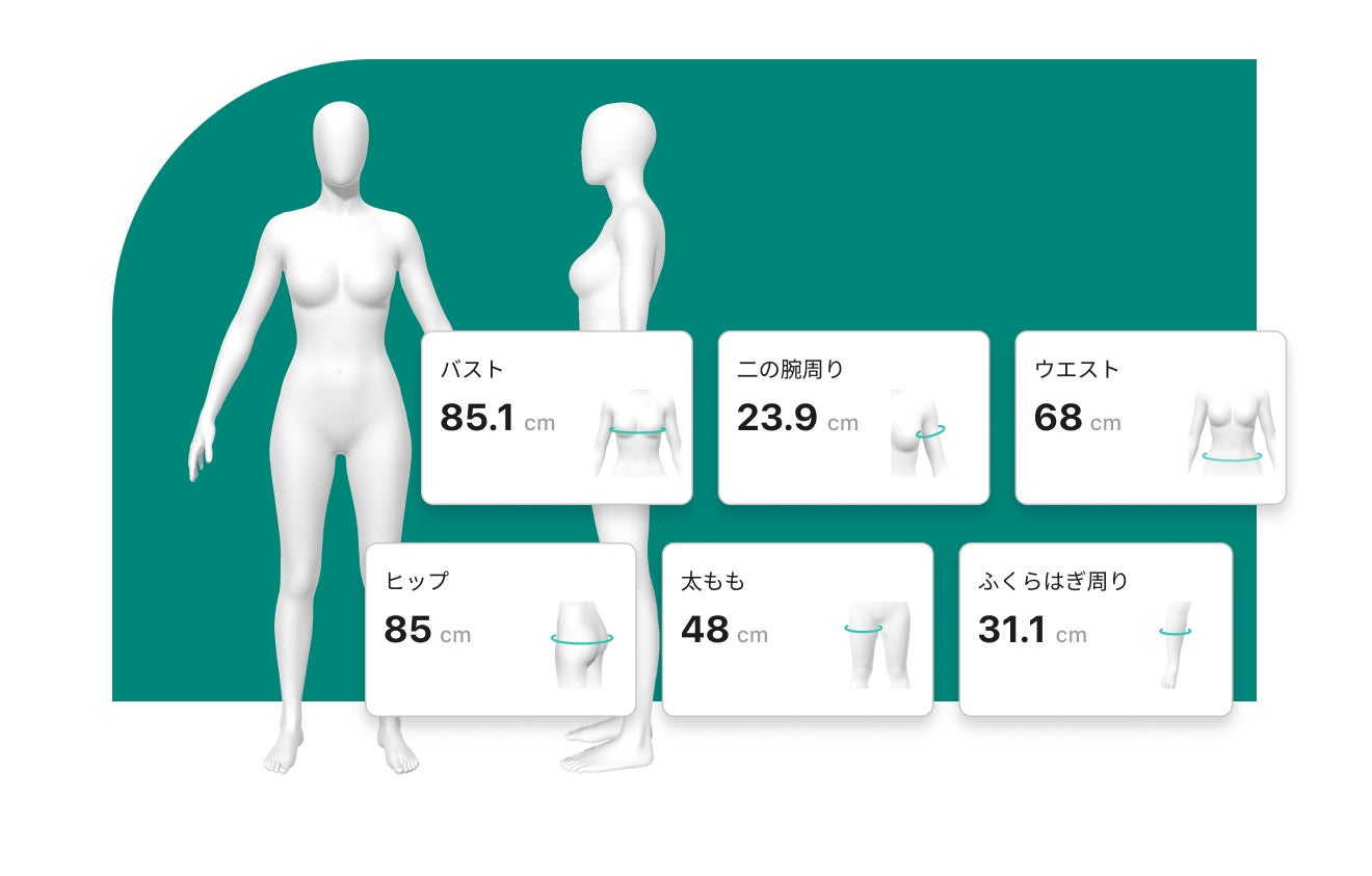 特別な装置やスーツを要さず、腹囲・肩幅・太ももなど身体の主要箇所のボディスキャンを可能にする、革新的なテクノロジーとして日々進化を遂げています。2019年の設立以来、BtoB事業において制服やユニフォーム、百貨店といったアパレル業界を中心に展開し、その後寝具やヘルスケア、ビューティー領域のサービスや業界へも技術導入を果たしてきました。一方で、これまで高精度のボディデータを自社サービスに組み込もうとすると、コスト面・工数面・技術面での課題が散見され、導入者様にとってボディスキャン技術の本格的な導入を検討するには壁があったのも事実です。
