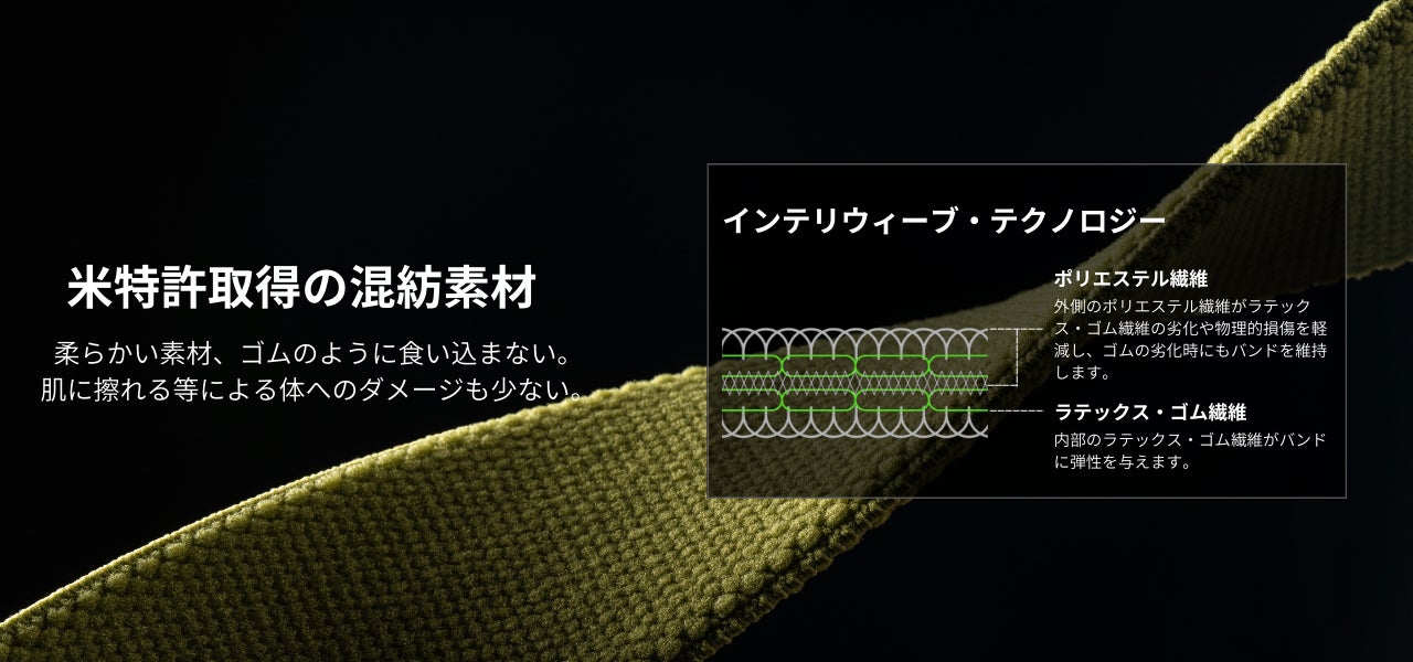 『VRTXバンド』は、独自のインテリウィーブ・テクノロジー(布繊維とゴム繊維を混紡)を用いられています。表面は一見布のようですが、中はゴム繊維であり、布繊維と混ぜて紡いだ構造です。この構造による触り心地は、ゴム素材のトレーニングチューブでは感じたことがないほど優しく心地良いです。