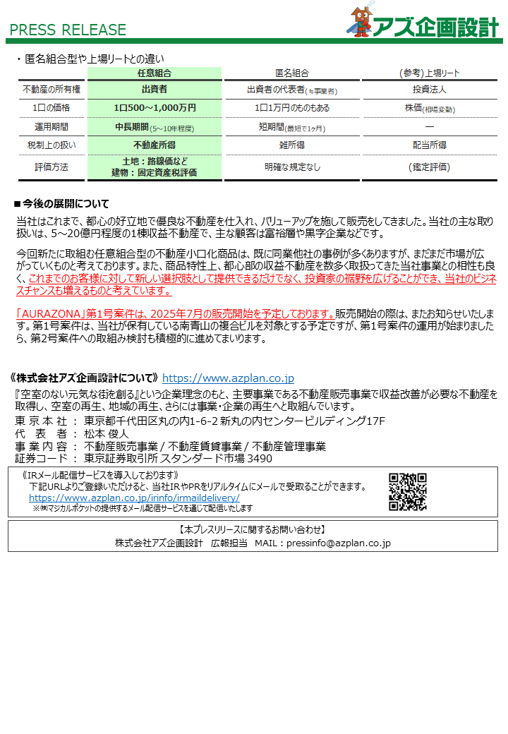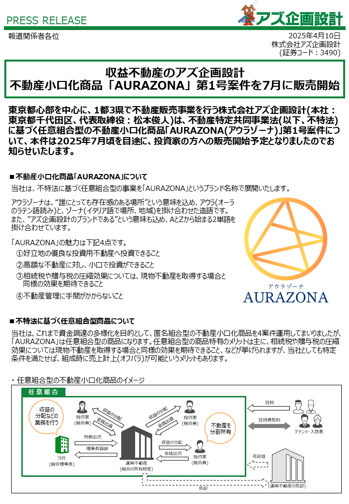 東京都心部を中心に、1都3県で不動産販売事業を行う株式会社アズ企画設計(本社:東京都千代田区、代表取締役:松本俊人)は、不動産特定共同事業法(以下、不特法)に基づく任意組合型の不動産小口化商品「AURAZONA(アウラゾーナ)」第1号案件について、本件は2025年7月頃を目途に、投資家の方への販売開始予定となりましたのでお知らせいたします。