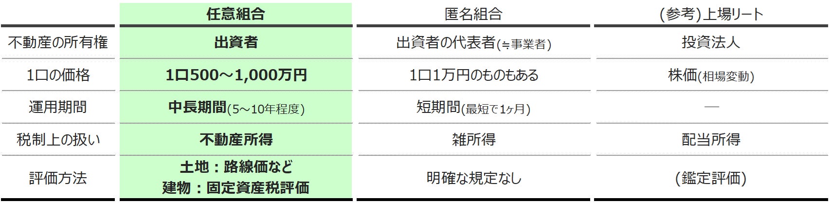 当社は、これまで資金調達の多様化を目的として、匿名組合型の不動産小口化商品を4案件運用してまいりましたが、「AURAZONA」は任意組合型の商品になります。任意組合型の商品特有のメリットは主に、相続税や贈与税の圧縮効果については現物不動産を取得する場合と同様の効果を期待できること、などが挙げられますが、当社としても特定条件を満たせば、組成時に売上計上(オフバラ)が可能というメリットもあります。
