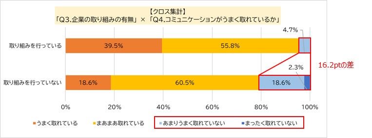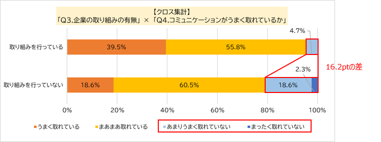●コミュニケーションを円滑にするための取り組みを行っていない企業で働く外国人社員は、コミュニケーションが「取れていない」割合が、取り組みを行っている企業で働く外国人社員より16.2pt高い。