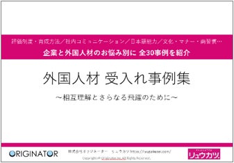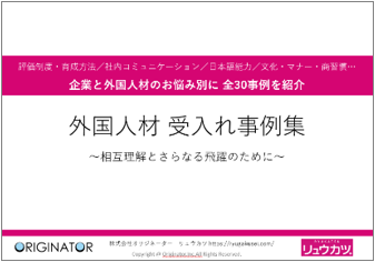外国人材の採用・活躍支援を行うオリジネーターの『リュウカツ®』は、当社がサポートした企業の中から、評価制度・育成方法/社内コミュニケーション/日本語能力/文化・マナー・商習慣…など企業と外国人材のお悩み別に 全30事例を紹介する事例集を無料配布しています。