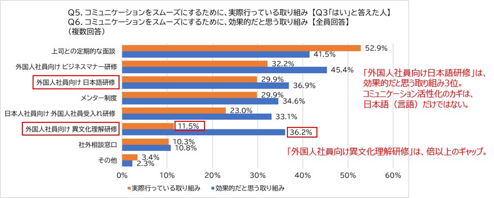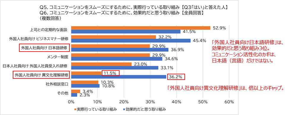 ●効果的だと思う取り組みは、1位「外国人社員向けビジネスマナー研修」(45.4%)、2位「上司との定期的な面談」(41.5%)となり、「外国人社員向け日本語研修」(36.9%)は3位に。コミュニケーション活性化のカギは、日本語(言語)だけではないことがうかがえる。