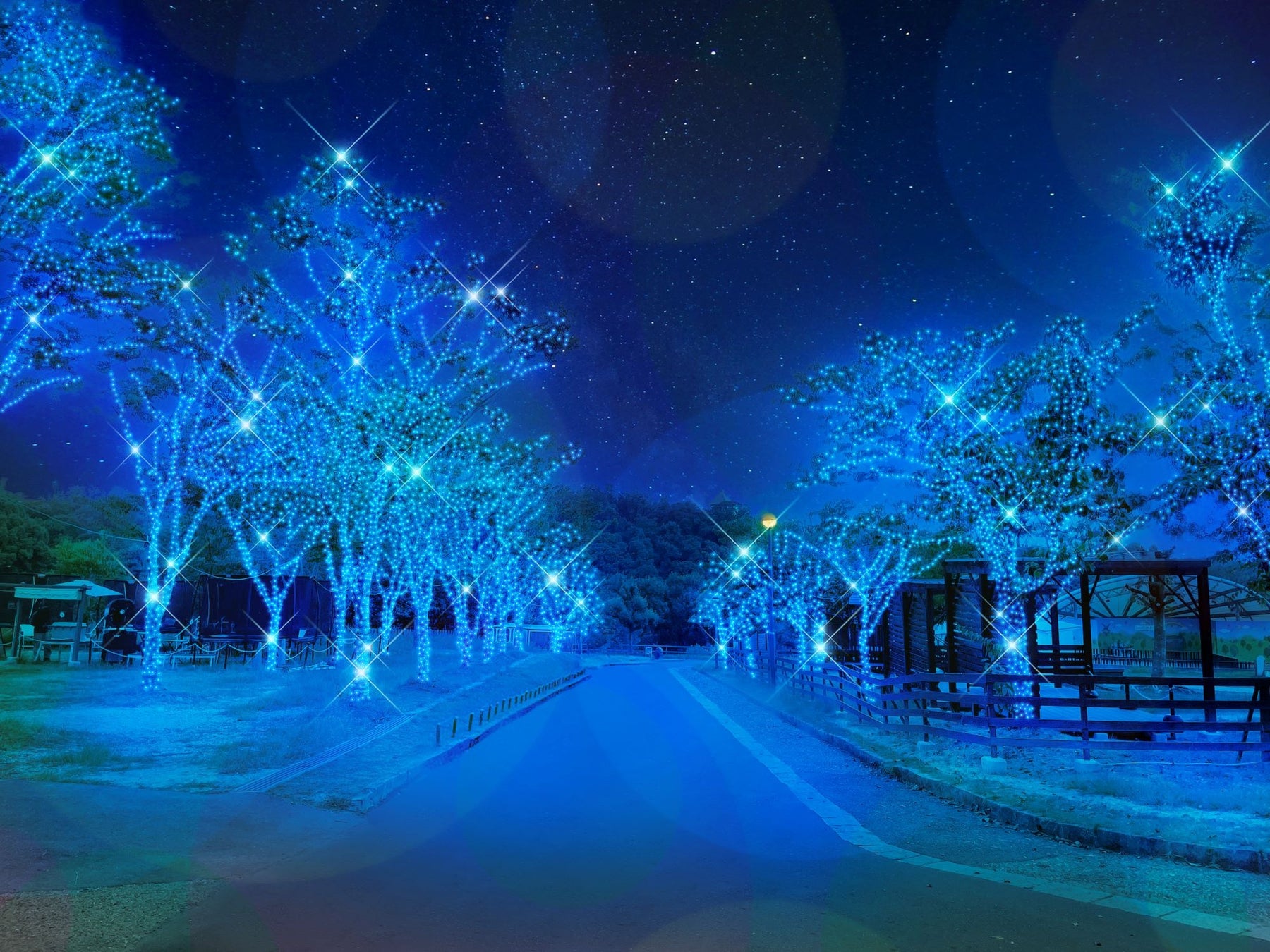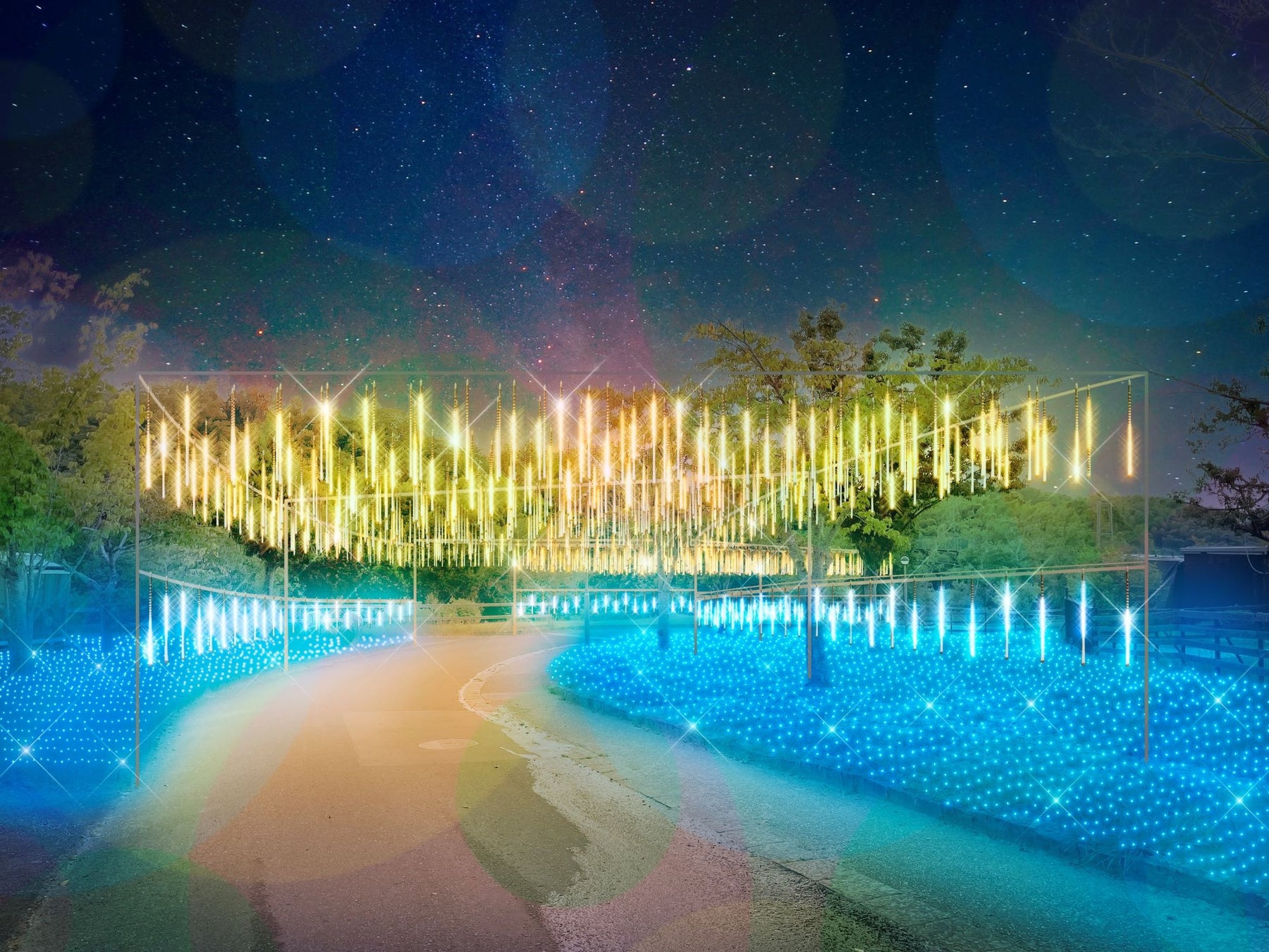 通路両側にある木々を青一色に染め上げ、まるで青く輝く森の中に入り込んだような没入感のあるエリアです。通路を進んでいくと空から流星群が降り注ぐような光の演出が現れ、幻想的なひとときをお楽しみいただけます。