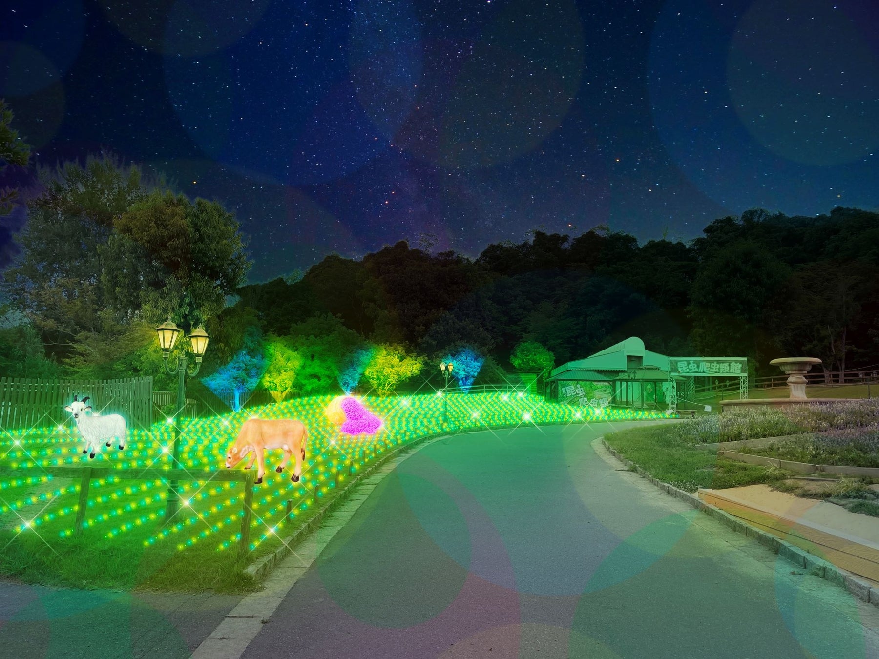 動物たちがお出迎えする牧場をイメージしたエリアでは、実際にハーベストの丘で飼育されているジャージー牛、ヤギ、ヒツジ、カピバラをモチーフとしたイルミネーションを各所へ設置。牧草をイメージした緑基調のLEDライト約10万球が光輝きます。