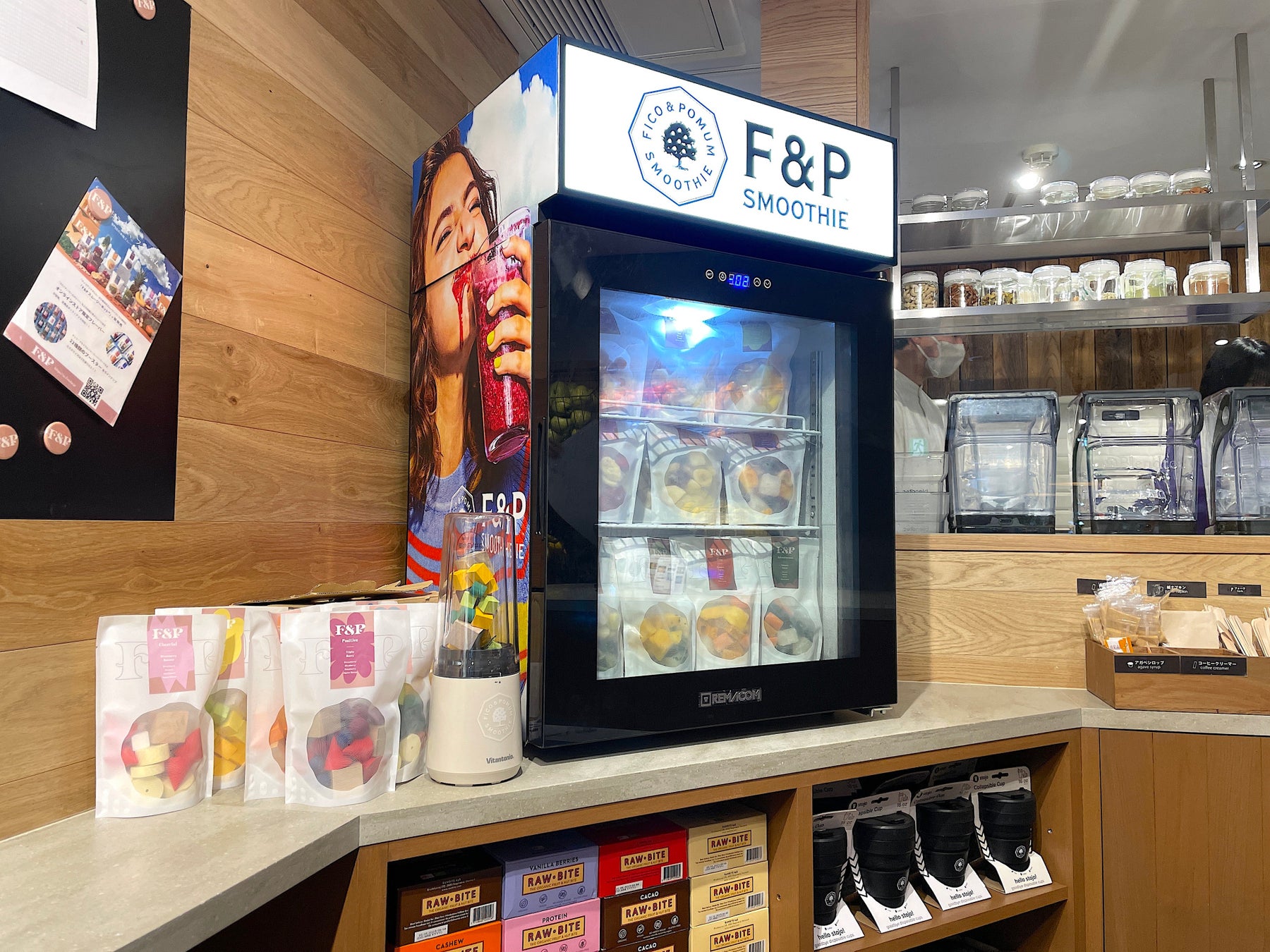 F&Pジャパン株式会社(所在地:東京都台東区、代表取締役:西野 照明)は、2023年1月7日にスムージー業界初(※) となる体験ショールーム型実店舗「F&P Smoothie Cafe」を青山にリニューアルオープン。独自開発したスムージーに必要な食材が1杯分となった冷凍パック「F&Pスムージーキット™️」を店頭にて体験できるデモンストレーションコーナーを新設。パートナー加盟プログラムやオフィス向けサービスを検討される法人顧客へのデモンストレーションとして、実際に店舗にて体験いただくことが可能になりました。