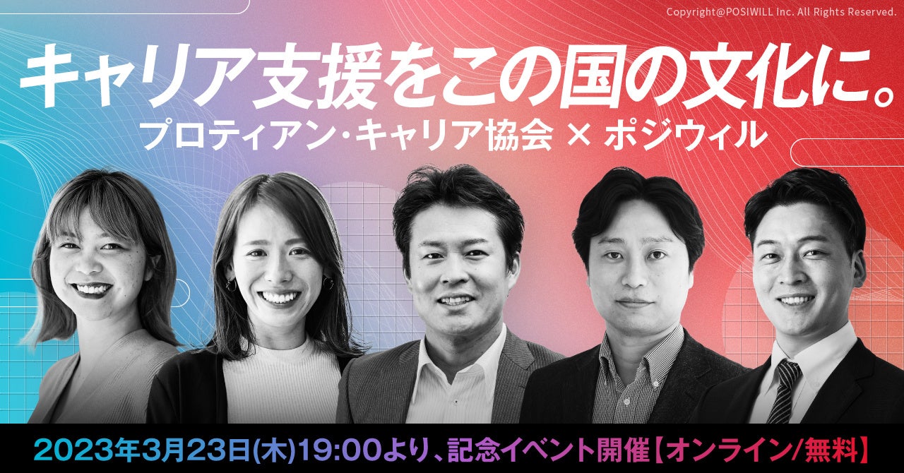 キャリアコーチング・サービス『POSIWILL CAREER』『POSIWILL CAREER for 企業』、およびキャリア支援者育成プラットフォーム『ポジウィル認定講座』を運営するポジウィル株式会社(東京都港区、代表:金井芽衣)は、2023年3月16日(木)より、組織と個人のより良き関係性構築と個人の主体的なキャリア開発を支援する一般社団法人プロティアン・キャリア協会(東京都新宿区、代表理事:田中研之輔・有山徹)とパートナーシップ契約を締結しました。