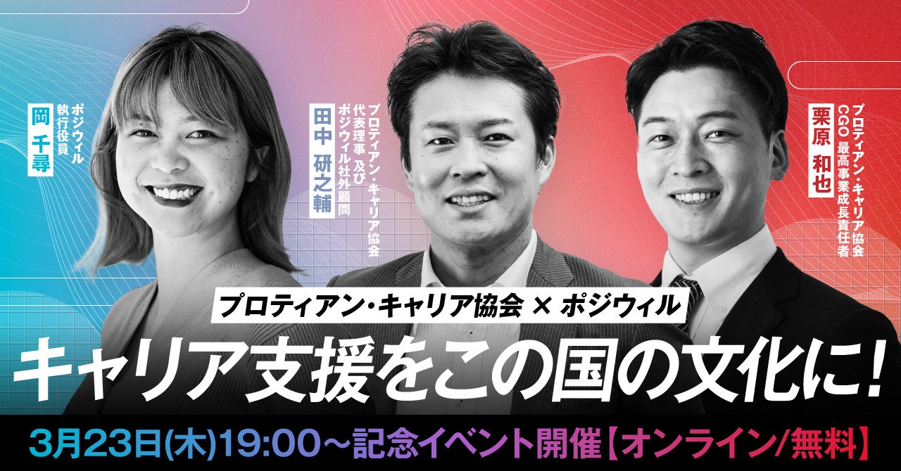 キャリア支援をこの国の文化にするためには、キャリア支援に対する社会的な信用が不可欠だと考えています。今回、「プロティアン」という最先端のキャリア論を提唱するプロティアン・キャリア協会と、豊富な支援実績を持つポジウィルが手を取ることで、誰もが安心・安全で、質の高いキャリア支援が受けられる世の中の実現を目指していきます。