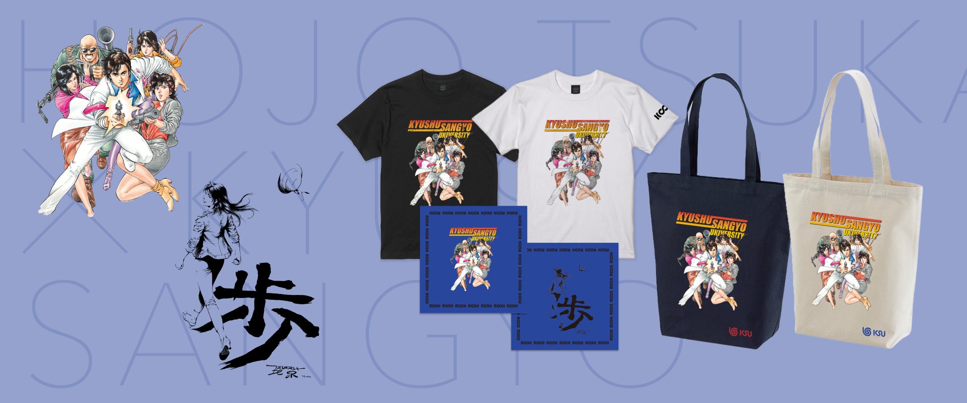 第1弾では、シティハンターやキャッツ・アイなど長年に渡り幅広い年齢層から支持を得ている漫画家で芸術学部卒業生の北条司先生とのコラボグッズ(Tシャツ、トートバッグ、バンダナ)を限定発売します。そのほか、MiiR(ミアー)やTHING FABRICS(シングファブリックス)などのブランドコラボグッズや、九州産業大学の新しいロゴデザインを使用したアパレルグッズなど、トレンド感を持ち合わせた日常で使えるラインナップを展開します。