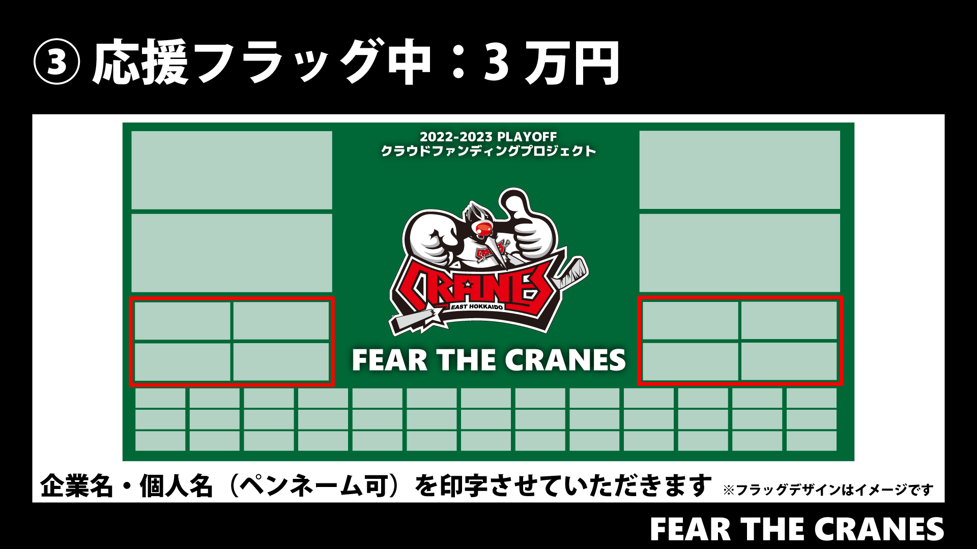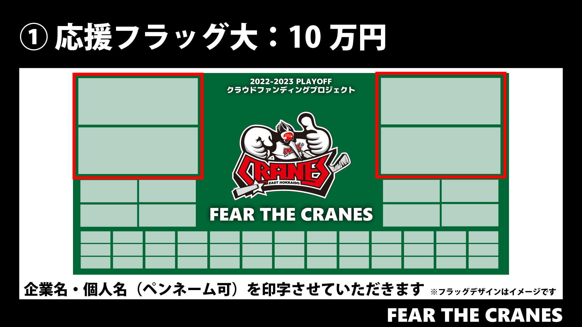 |プレーオフ時に掲げるフラッグに企業名、個人名(ペンネーム可)を載せることができます。