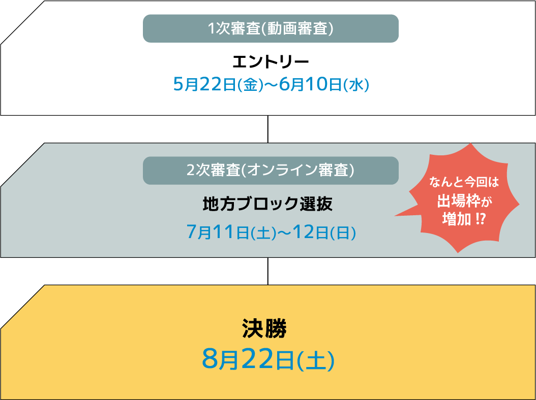 ・1次審査 ・応募数が1~99チームの地域ブロックは、上位3チームを選出 ・応募数が100~199チームの地域ブロックは、上位4チームを選出 ・応募数が200~299チームの地域ブロックは、上位5チームを選出 ※以降、応募数が100チーム増えるごとに選出チームを1チームずつ追加 |