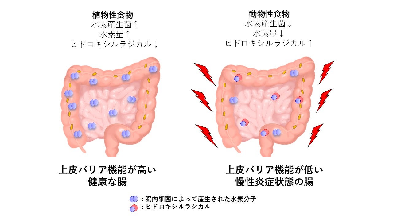 3.食の欧米化による悪循環: 動物性タンパク質や脂肪の過剰摂取は、腸内の水素産生菌を減少させ、水素産生量を低下させます。これにより、ヒドロキシルラジカルが十分に消去されなくなり、腸は慢性炎症状態に陥ります。さらに、上皮細胞のバリア機能も低下し、潰瘍性大腸炎の発症リスクが高まります。
