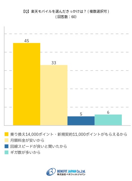 楽天モバイルを選んだきっかけは「乗り換え14,000ポイント・新規契約11,000ポイントがもらえるから」が50.60%で最多となりました。