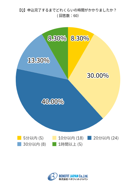 申込完了までの所要時間は「20分以内」が40.00%で最も多く、次いで「10分以内」が30.00%という結果でした。
