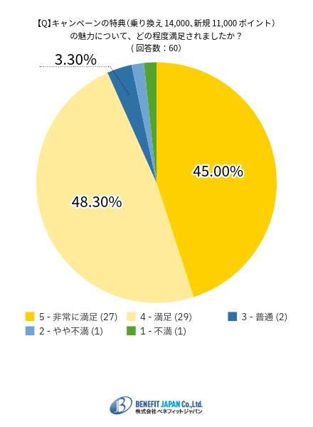 ポイント還元の手厚さや月額料金の安さが選択理由として目立ち、キャンペーン特典に対する満足度は 約93.3%が「満足・非常に満足」と回答 するなど高評価となっています。