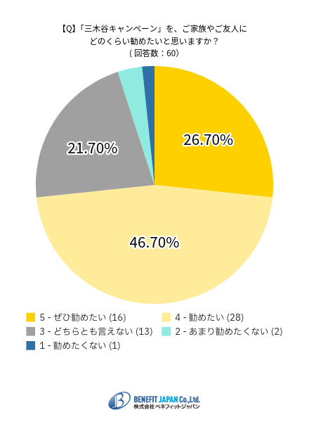三木谷キャンペーンについて、73.3%の利用者が家族や友人におすすめしたいと回答しています。