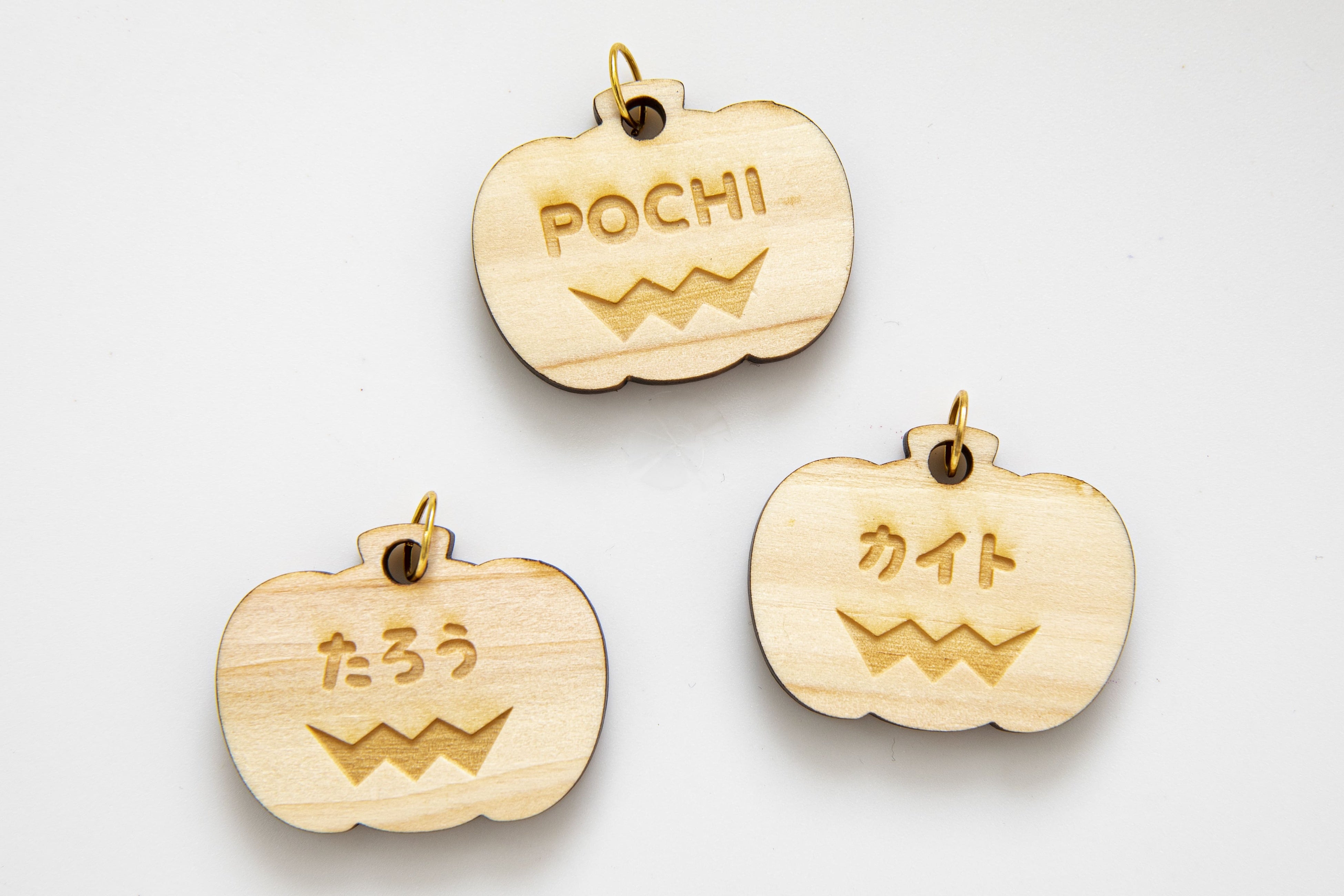 ワンちゃんのお名前刻印ができる迷子札ウッドタグをお付けします。お客様のご希望に合わせ1つ1つ刻印しお届けします。