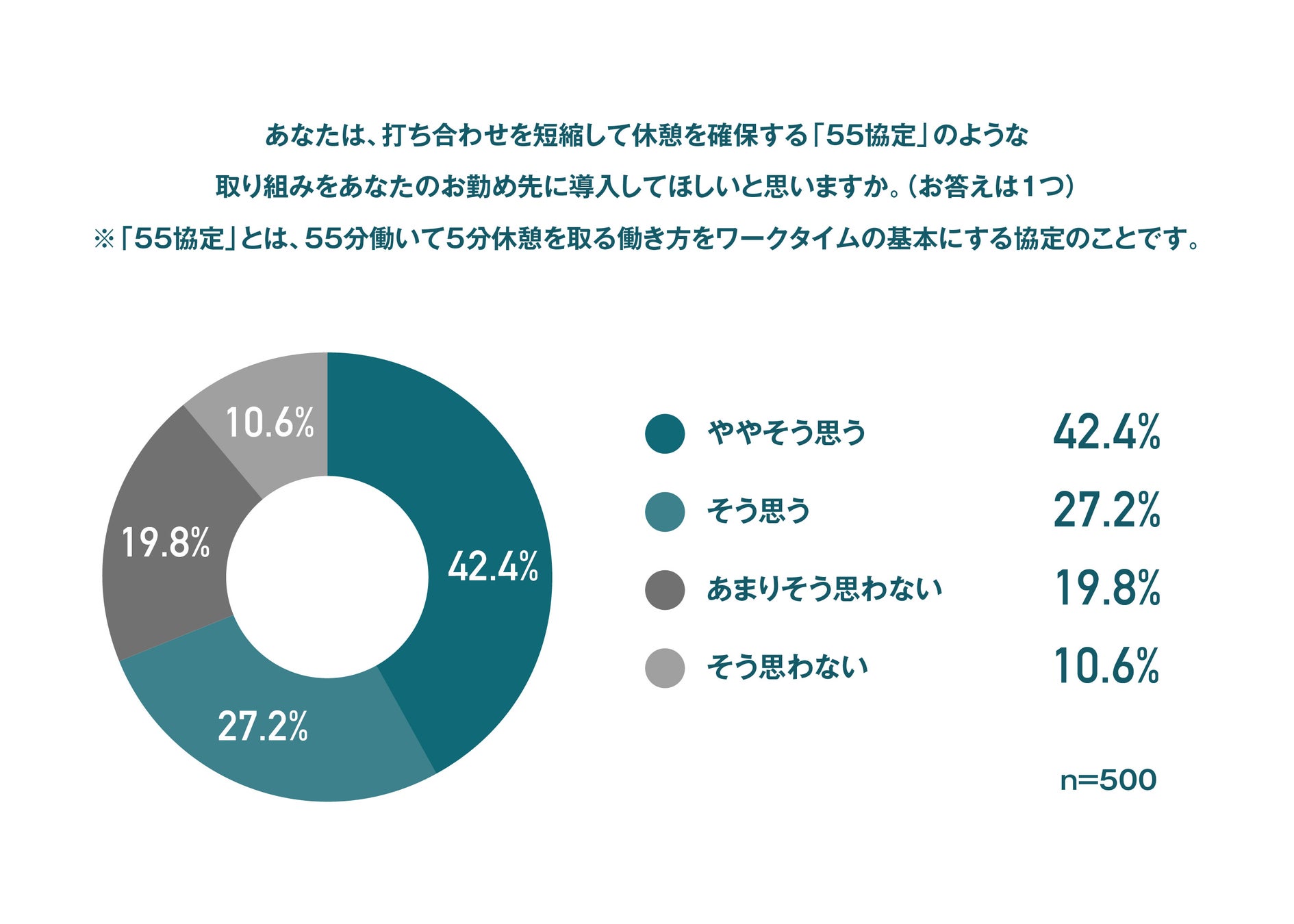 - 約7割(69.6%)が、「55分間働いて5分間休憩を取る働き方」を勤務先で導入してほしいと回答。