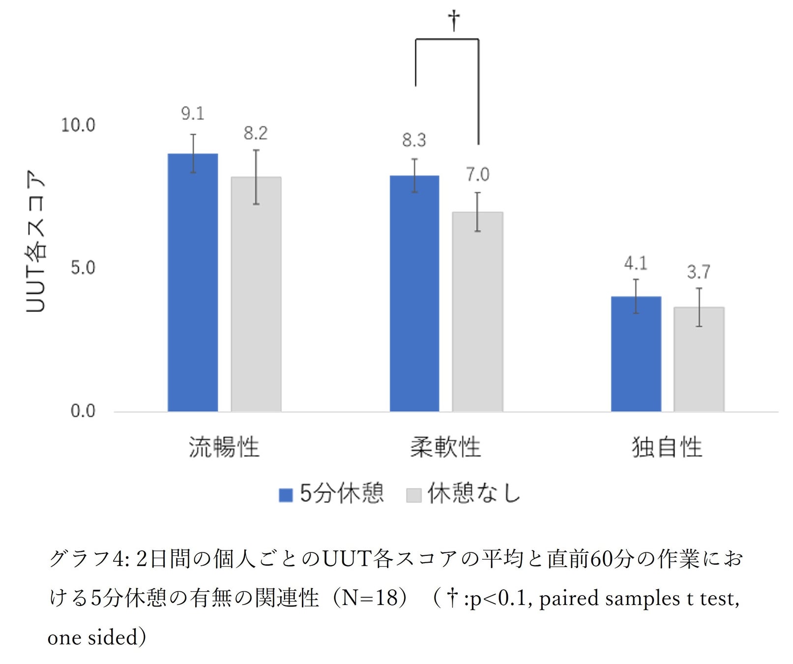 また、業務中に5分間の休憩を取ることが業務における生産性にどのような影響を与えるかを確認するため、脳の認知機能を調査する実験を行いました。その結果、業務中の5分間休憩により知的生産性が向上したことを示唆する結果が得られました。