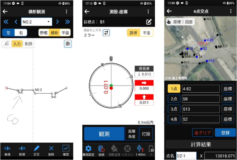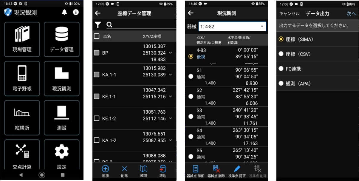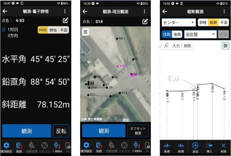 交点計算、電子野帳観測、現況観測、縦断観測、横断観測、測設など、外業用途における機能を搭載しています。
