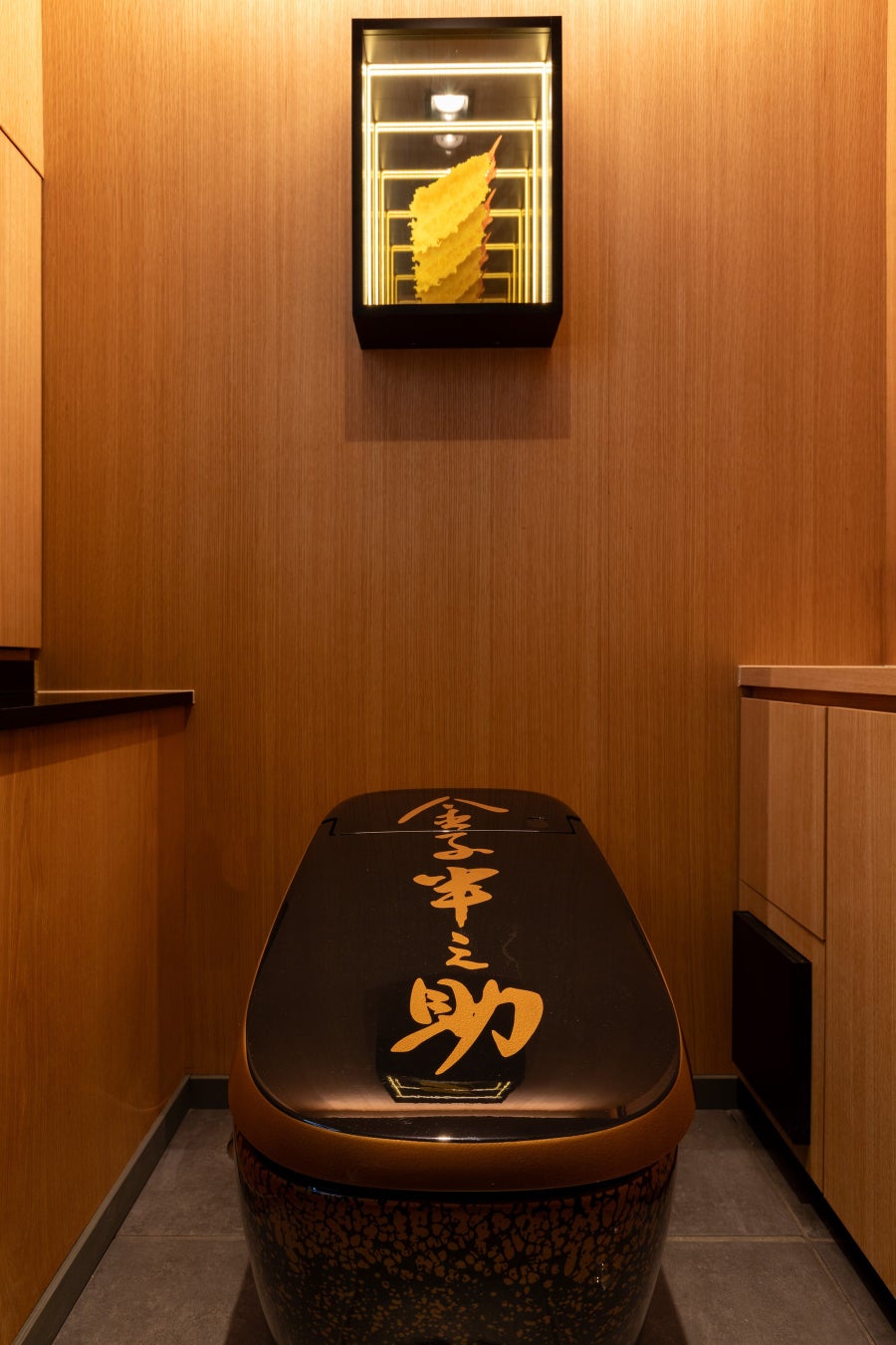 世界中のすべてお客様に心を配り、楽しく最高のおもてなしを提供するという考えのもと、金子半之助と深い縁を持つ「天ぷら」、そして「油滴の美」、「おもてなし」という三つの日本文化を込め、お手洗い空間を創造しました。