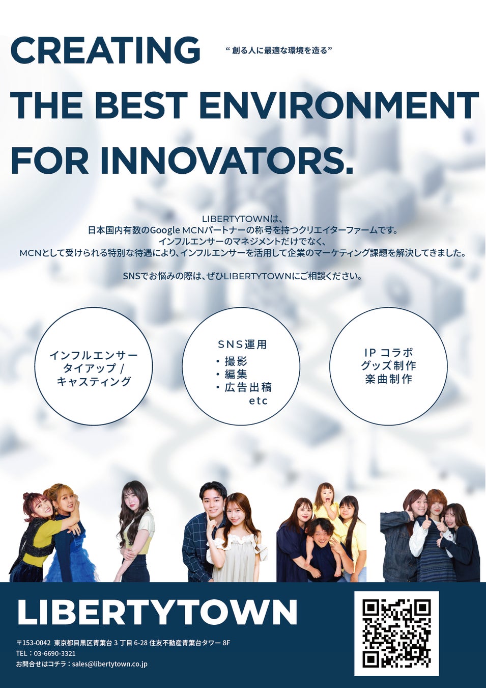 ・事業内容:株式会社リバティタウンは2017年5月に創業、”創る人に最適な環境を造る”をテーマにクリエイターのマネジメント事務所を運営しております。YouTubeのMCNであるリバティタウンだからこそできるマネジメントは、チャンネル開設から最大化まで全面サポートいたします。SNS戦略サポート、動画編集の講習、企業タイアップの提供などクリエイターが『創る』に最大限のチカラを発揮できるプロダクションです。企業タイアップ広告や企業公式アカウント運用についても弊社にお任せください。