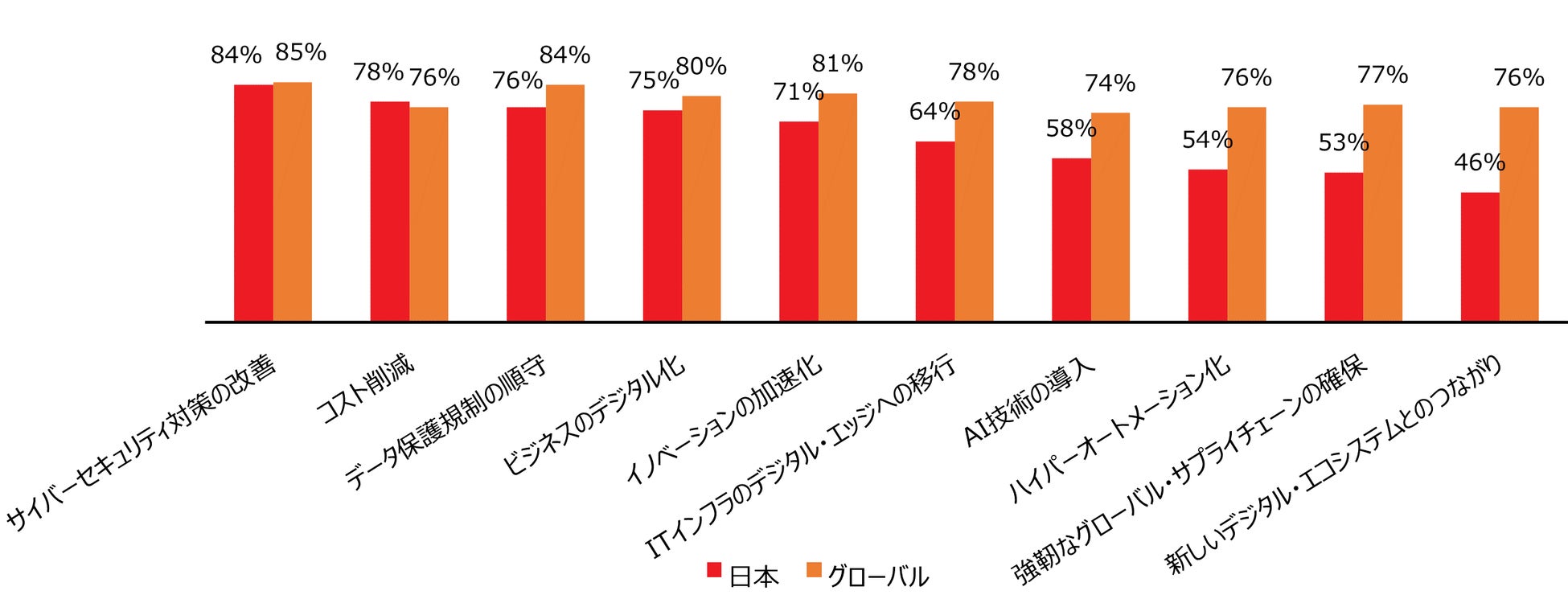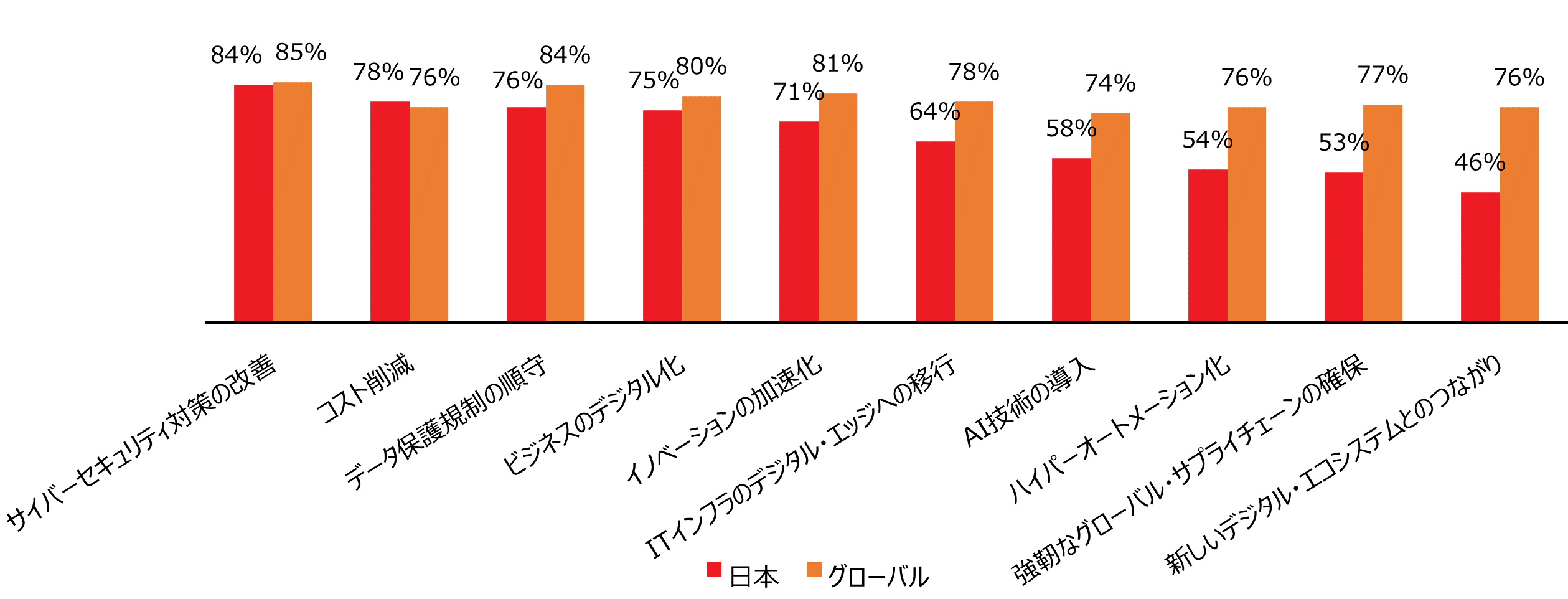 また、日本のIT意思決定者の多くが、将来を見据えた優先事項として、他国同様、サイバーセキュリティ対策の改善、データ保護規制の順守、ビジネスのデジタル化、イノベーションの加速化を挙げています。一方、ITインフラのデジタル・エッジへの移行、AI技術の導入、ハイパーオートメーション、強靭なグローバルサプライチェーンの確保、新しいデジタル・エコシステムとのつながりを挙げた回答率は、世界平均より14%~30%ポイント低い傾向にありました。