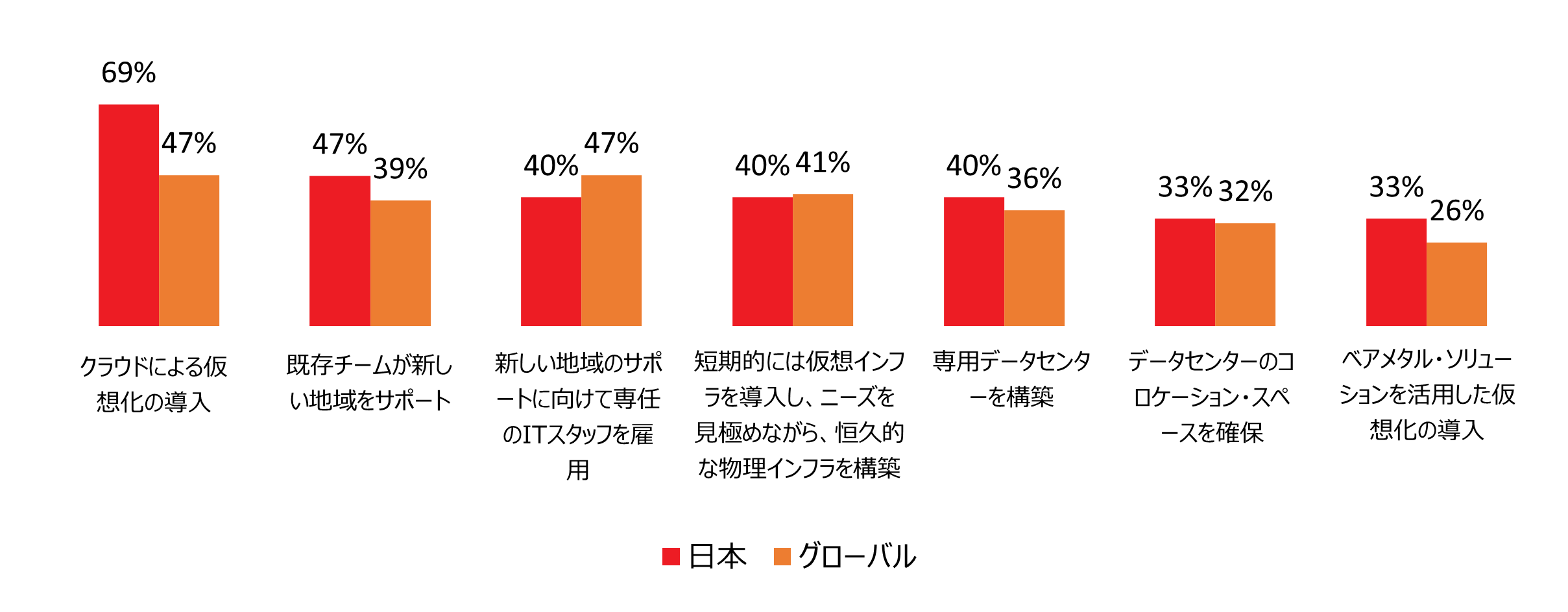 問:新規市場へのビジネス参入をどのようなIT施策でサポートする予定ですか?現在、新しい地域、国、都市にビジネス参入していると回答したサブサンプル(日本の回答者数:60、グローバルの回答者数:1,892)