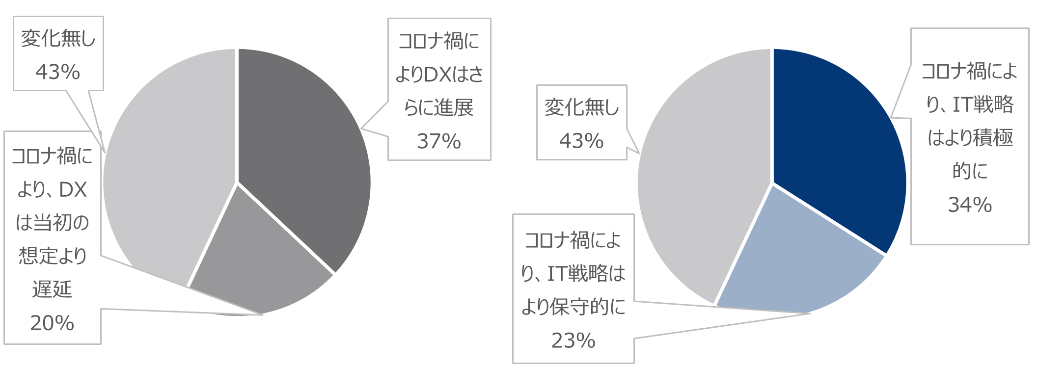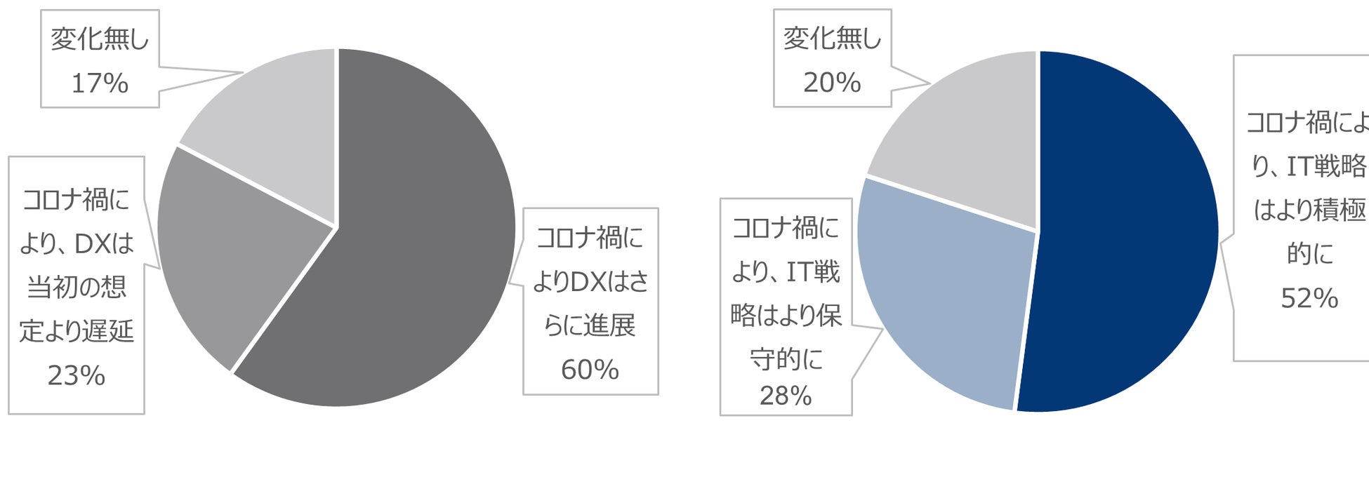 今回の調査での顕著なポイントとして、コロナ禍でのIT戦略やDXの推進に関する問いに対して、日本のIT意思決定者の最多回答がいずれも「変化無し」となりました。これに対して、他国のIT意思決定者の回答では、コロナ禍を通じてIT戦略とDXが「より積極的になった」が過半数を占めました。