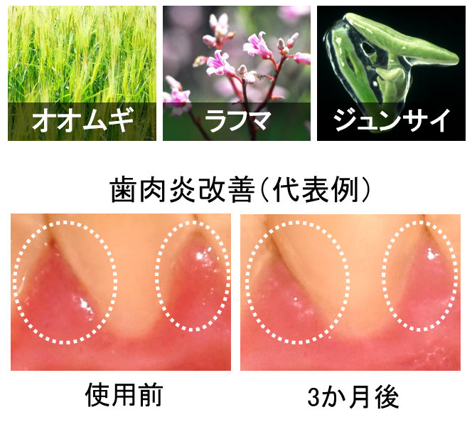 さらに、オオムギエキスにラフマ、ジュンサイから抽出したエキスを組み合わせることで、歯ぐきのコラーゲンを維持する効果に加え、炎症を抑える効果、口臭の発生を抑制する効果も見出しました。