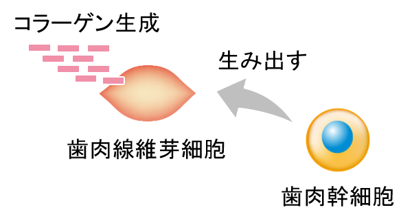 歯ぐきのコラーゲンは、「歯肉線維芽細胞」と呼ばれる細胞が生成しています。また、この歯肉線維芽細胞を生み出しているのは「歯肉幹細胞」と呼ばれる歯ぐきの幹細胞です。つまり、歯肉幹細胞は歯ぐきのコラーゲンを供給するもととなる重要な細胞です。