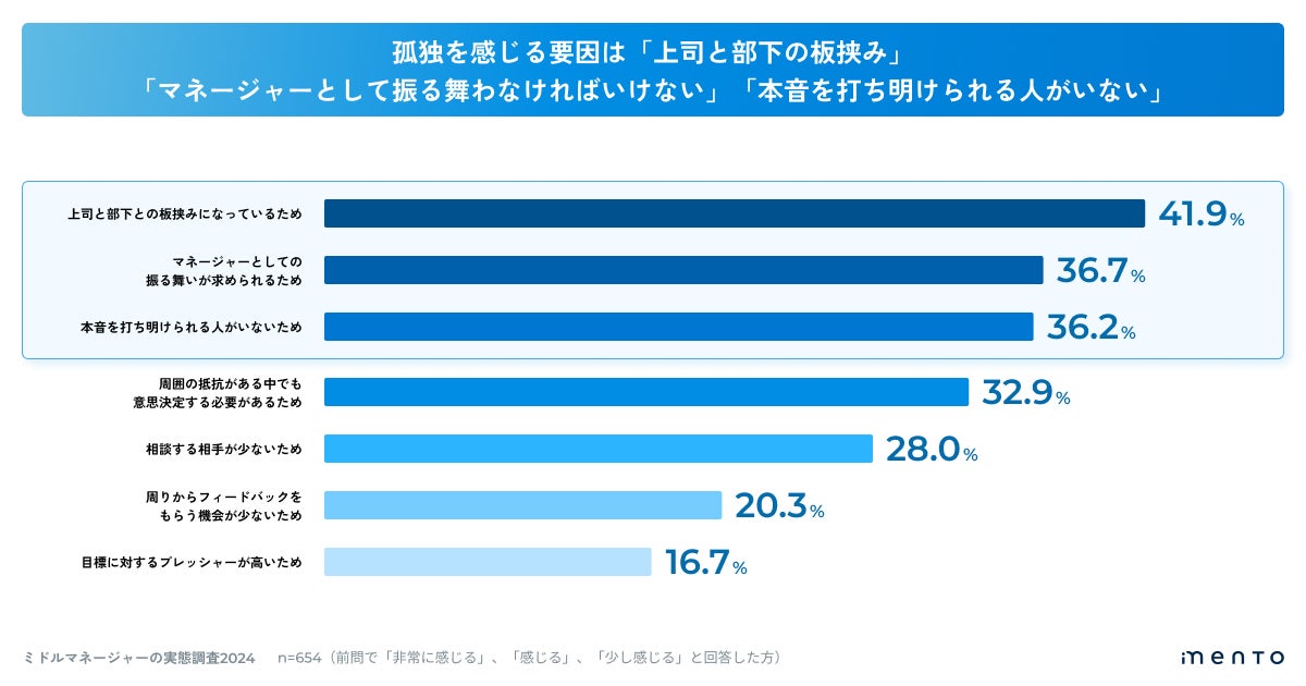 孤独を感じる要因として思い当たるものを聞いたところ、「上司と部下との板挟みになっているため」(41.9%)、「マネージャーとしての振る舞いが求められるため」(36.7%)、「本音を打ち明けられる人がいないため」(36.2%)という結果になりました。