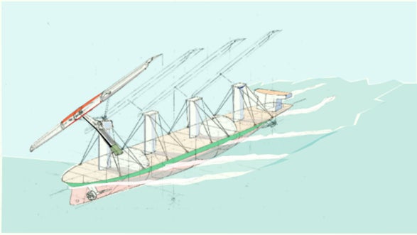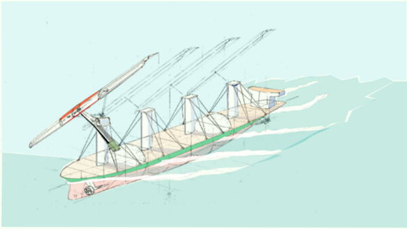 飛行機の翼のような帆を左右に傾け向い風でも前進する帆技術を開発