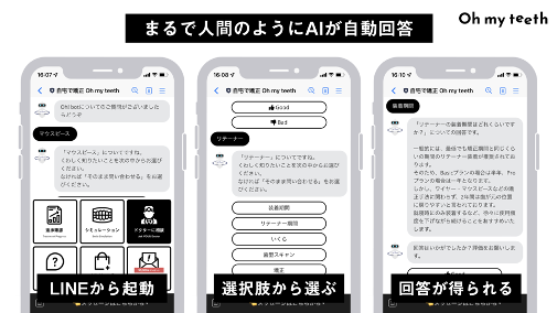 Oh my teethは、マウスピース矯正サービスを展開しており、LINEやビデオ通話といったオンライン診療の仕組みを活用することで、定期的な通院なしでリモート矯正ができる点が特徴です。Oh my teethでは、これまでもLINEによるカスタマーサポートにおいてチャットボットサービスを利用していましたが、期待以上の顧客体験向上や業務効率化を図れないことが課題でした。